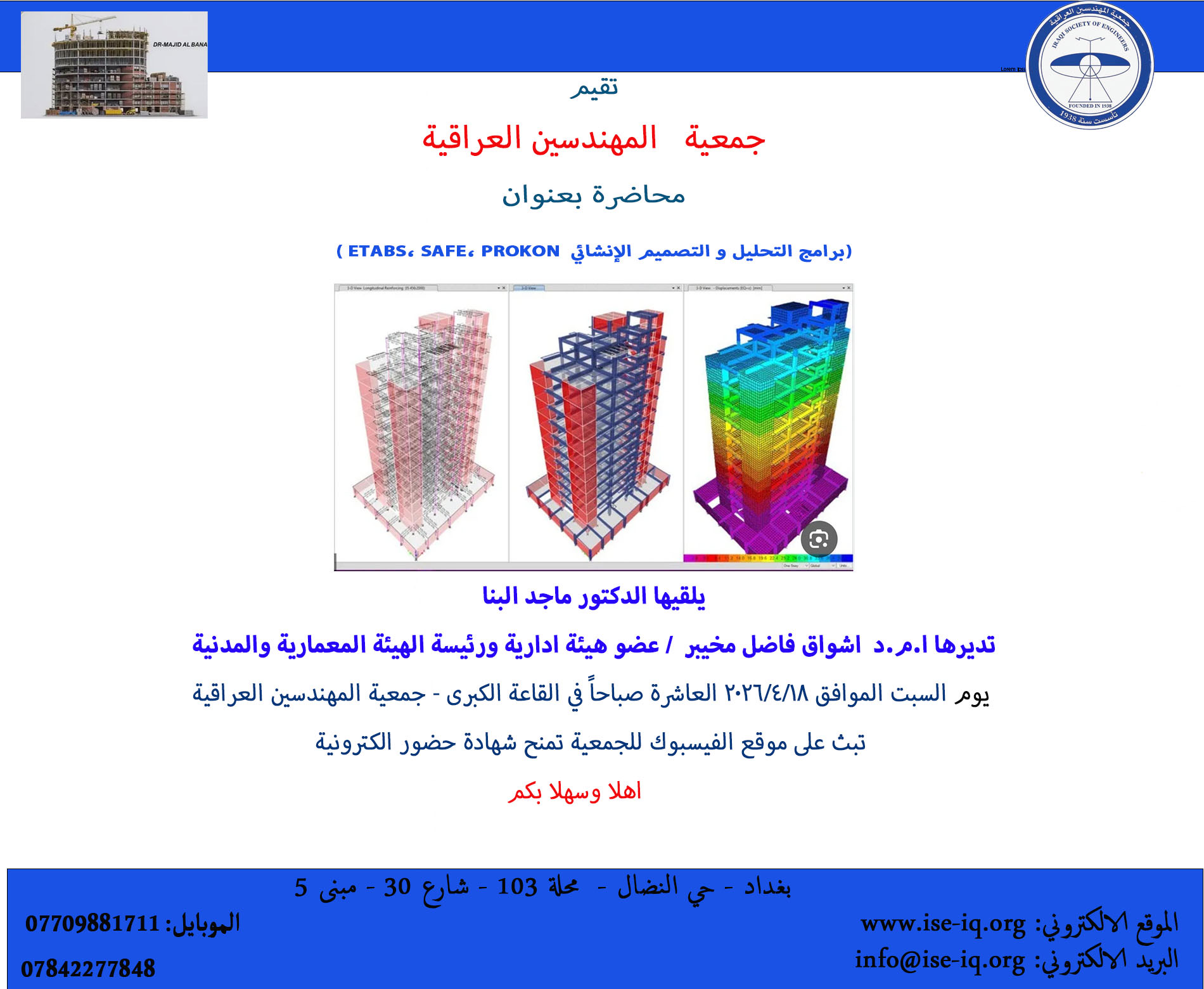 تقيم جمعية المهندسين العراقية ندوة علمية تحمل عنوان (التحليل والتصميم الانشائي باستخدام البرامج (details -prota structure suite)