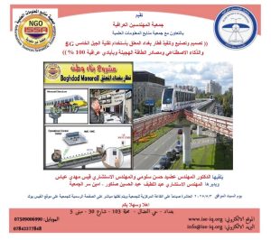 تصميم وتصنيع وتنفيذ قطار بغداد المعلق باستخدام تقنية الجيل الخامس 5Gوالذكاء الاصطناعي ومصادر الطاقة الهجينة وبايادي عراقية 100%